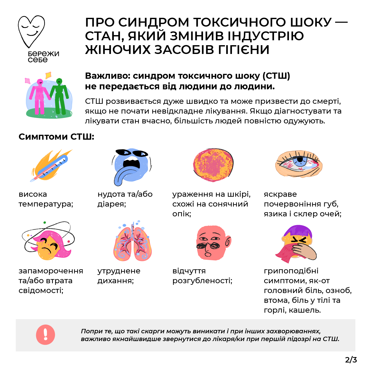 Симптоми синдрому токсичного шоку Як правило, при «менструальній формі» все починається на 3 – 4 день циклу з різкого підвищення температури до 39 С. Артеріальний тиск падає до небезпечно низьких рівнів, з'являється запаморочення. Інші клінічні ознаки розвиваються протягом декількох годин.